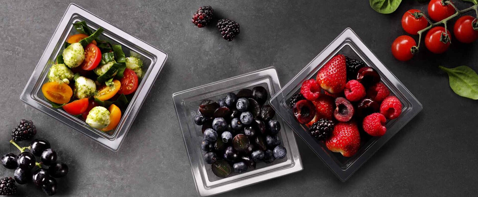 Elevate shelf appeal with our pyramid-shaped, fully recyclable PET containers. Our crystal-clear, top-sealed salad bowls are perfect for showcasing premium convenience food.